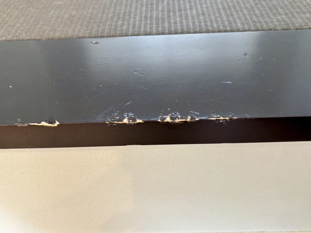 近くで見ると角の削れや表面に凹凸が多数ついていました。補修方法として、ふみ面の取替か傷をリペア補修するかでご検討して頂きました。